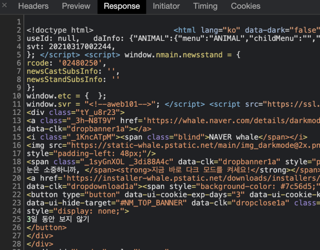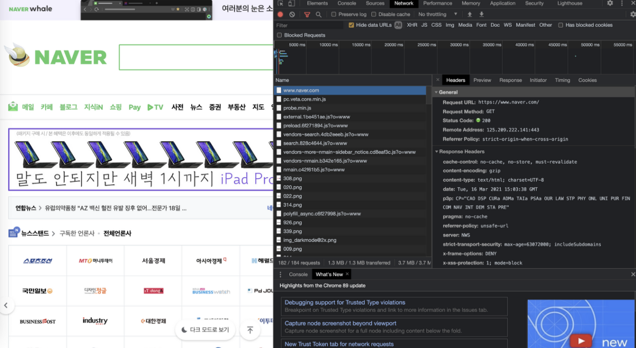 우리는 크롬과 같은 브라우저의 개발자툴을 통해 직접 요청과 응답 메시지를 확인할 수 있다. (네트워크 탭)