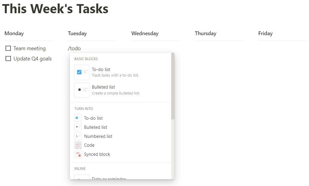 줄을 나누는 /divider 및 할 일 목록을 위한 /todo 등의 명령을 사용하여 약간의 기본적인 형식을 추가하면 된다. 그러면 각 주의 목표를 맵핑 하기 위한 작은 구조가 만들어진다.