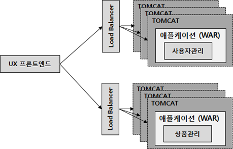 예를 들어 사용자 관리 서비스는 독립적인 war파일로 개발되어, 독립된 톰캣 인스턴스에 배치된다. 확장을 위해서 서비스가 배치된 톰캣 인스턴스는 횡적으로 스케일 (인스턴스 수를 더함으로써)이 가능하고, 앞단에 로드 밸런서를 배치하여 서비스간의 로드를 분산 시킨다.