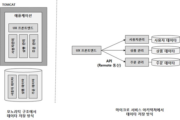 ※ 모노리틱 아키텍쳐가 꼭 나쁘다는 것이 아니다. 규모가 작은 애플리케이션에서는 배포가 용이하고, 규모가 크더라도, call-by-reference call에 의해서 컴포넌트간 호출시 성능에 제약이 덜하며, 운영 관리가 용이하다. 또한 하나의 구조로 되어 있기 때문에, 트렌젝션 관리등이 용이하다는 장점이 있다. 즉 마이크로 서비스 아키텍쳐가 모든 부분에 통용되는 정답은 아니며, 상황과 필요에 따라서 마이크로 서비스 아키텍쳐나 모노리틱 아키텍쳐를 적절하게 선별 선택 또는 변형화 해서 사용할 필요가 있다.