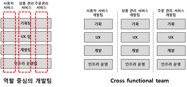 cross function team 모델은 하나의 팀에 UX, 개발팀,인프라팀등 소프트웨어 시스템을 개발하는데 필요한 모든 역할을 하나의 팀에 구성하고 움직이는 모델로, 각 서비스 개발팀이 cross functional team이 되서 움직인다.