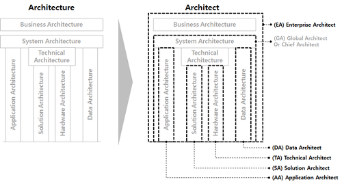 아키텍쳐를 설계 하는 사람은 아키텍트(Architect)라고 한다. 이 아키텍트는 아키텍쳐 설계 프로세스에서 정의한 각 아키텍쳐에 대해서 아키텍쳐를 설계하는 역할들이 정의된다. 계층 구조를 제외하면 아키텍쳐는 5가지로 분리된다.(http://bcho.tistory.com/667 참조) Business Architecture, Application Architecture, Solution Architecture, Data Architecture로 분리되며, 아키텍트 역시 이 5개 분야에 걸쳐서 총 5개의 역할로 정의된다.