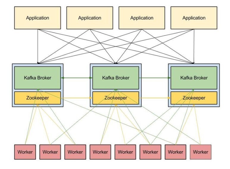 Kafka는 확장성(scale-out)과 고가용성을 위하여 broker들이 클러스터로 구성되어 동작하도록 설계되어있습니다. 심지어 broker가 1개 밖에 없을 때에도 클러스터로써 동작합니다. 클러스터 내의 broker에 대한 분산 처리는 아래의 그림과 같이 Apache ZooKeeper가 담당합니다.
