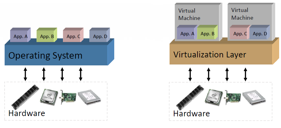 | 1개의 머신에서 여러 개의 애플리케이션을 구동하는 것은 충돌 등의 문제를 발생시킬 수 있다. | 하드웨어와 무관하게 원하는 운영체제나 그에 맞는 애플리케이션을 실행할 수 있다. |