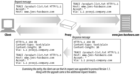 클라이언트에서 TRACE 메시지를 보내면 중간에 프록시 같은 애들이 헤더 쪽에 값을 넣어주고 서버쪽에서 루프백 진단을 한 다음에 본문에 내용을 넣어서 클라이언트에게 전달한다. 이때 클라이언트에서 엔터티 바디를 사용하지 않은 점을 기억하자.