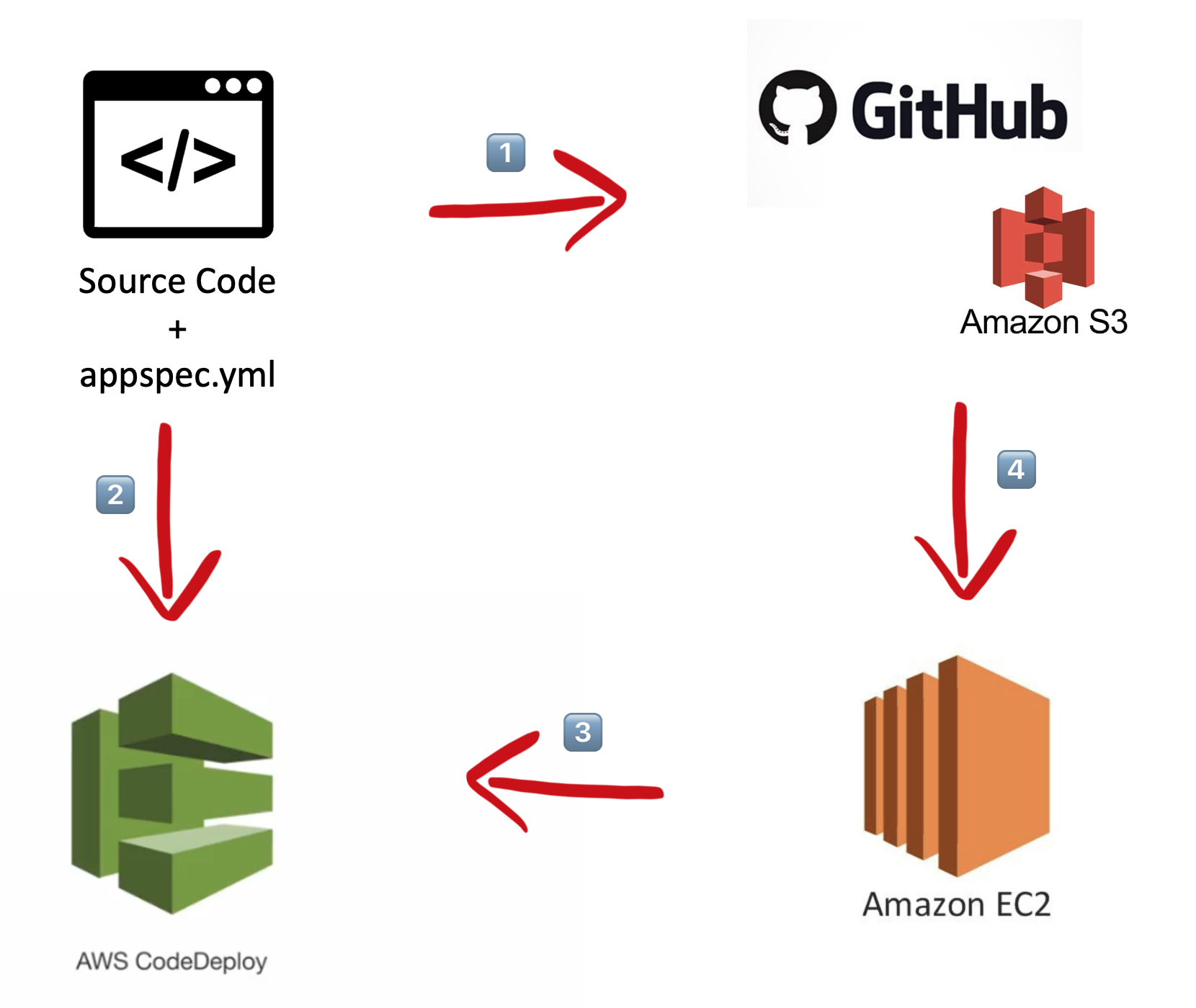 CodeDeploy를 사용하기 위해서는 먼저 인프라를 프로비저닝해야 한다. Deployment에서 인프라를 자동으로 생성해주지는 않기 때문에 내가 어디에 이 애플리케이션을 배포할 것인지, 어떤 환경에 배포할 것인지 등을 정하여 미리 생성해두어야 한다. 그 후 배포하고자 하는 환경에 CodeDeploy Agent를 설치해야 한다. 설치된 agent가 지속적으로 CodeDeploy를 polling 하면서 새로 배포해야 할 정보들을 받아온다. 그 후 배포할 애플리케이션의 코드와 appspec.yml을 github 혹은 S3에 업로드한다. 여기까지 Deployment를 생성하기 위한 사전 설정이 끝났다면 CodeDeploy application을 생성한다. 그리고 배포를 수행할 배포 그룹을 설정하고 앞에서 프로비저닝한 인프라를 지정해준다. 배포 생성 후 Deploy를 생성하여 수행하면 정의한 appspec.yml에 따라 동작하며 배포한다.