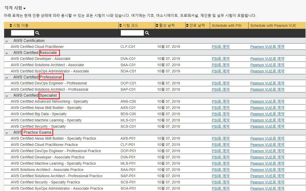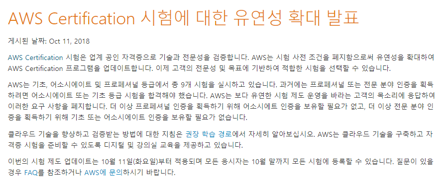 출처 : AWS 공식 홈페이지( https://aws.amazon.com/ko/about-aws/whats-new/2018/10/announcing-more-flexibility-for-aws-certification-exams)