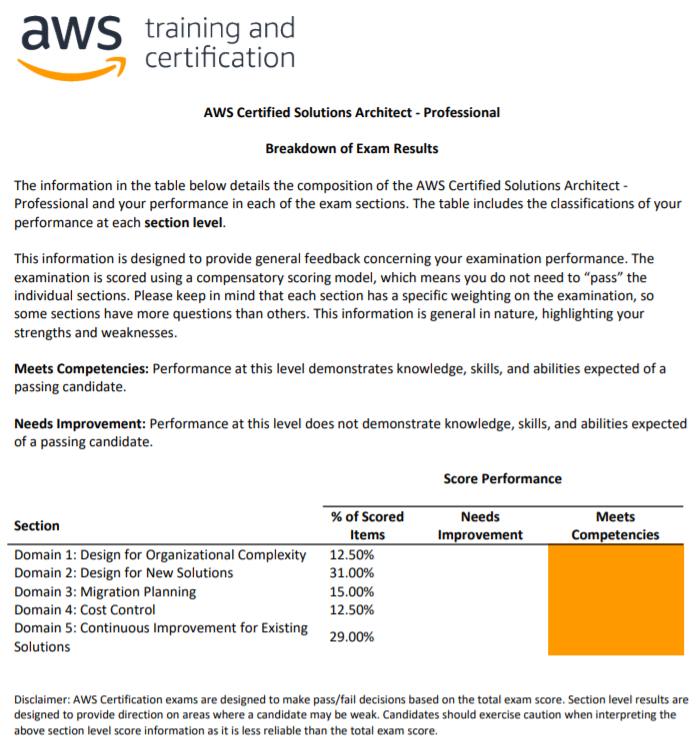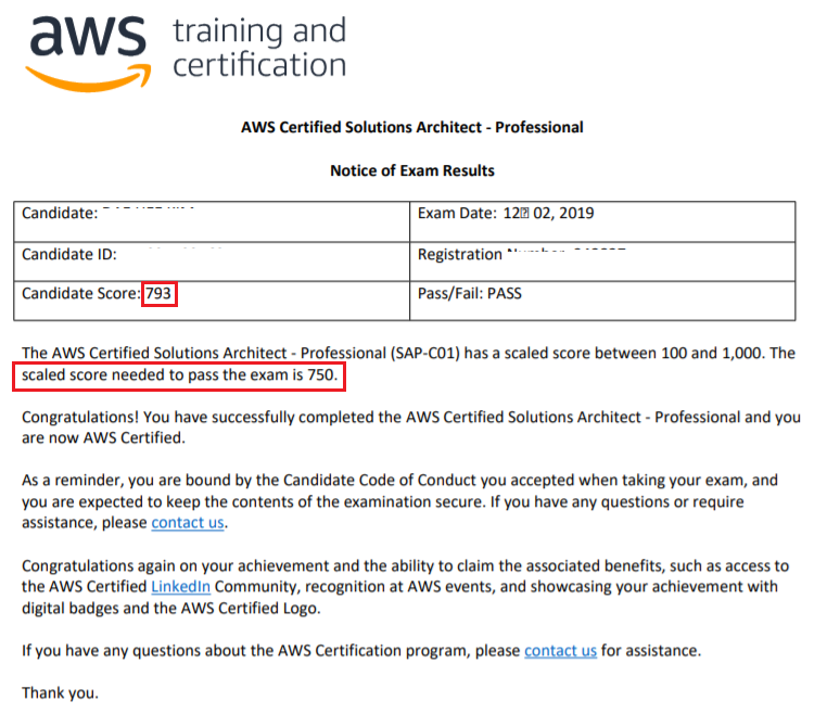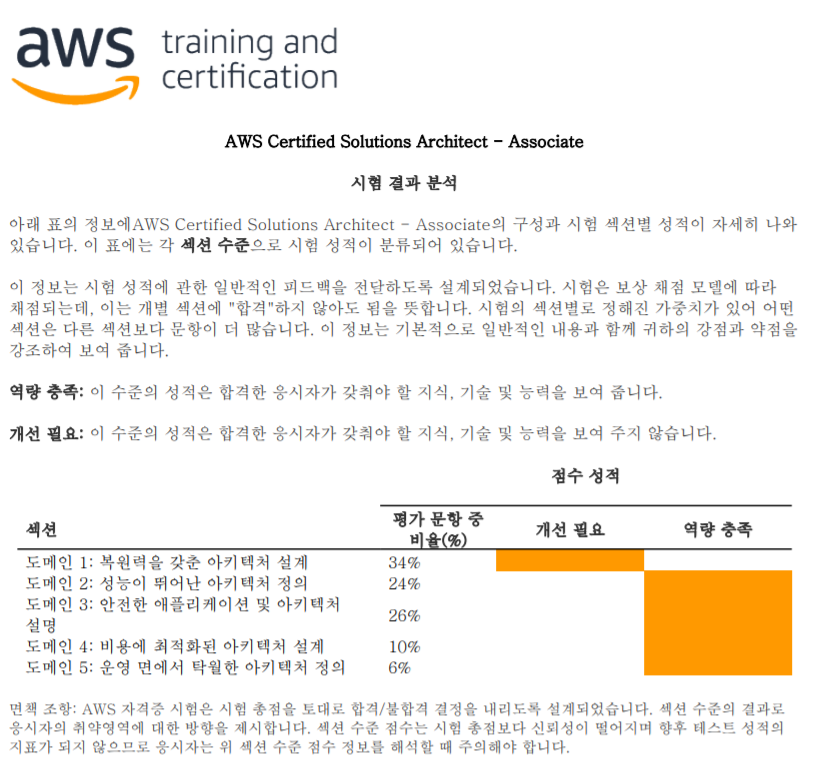 응시한 시험의 합격/불합격 여부, 합격 기준, 취득 점수, 도메인별 성적(합격여부와 무관) 등의 정보를 제공 해주며, 시험 결과는 보통 1일 이내에 메일로 보내준다.