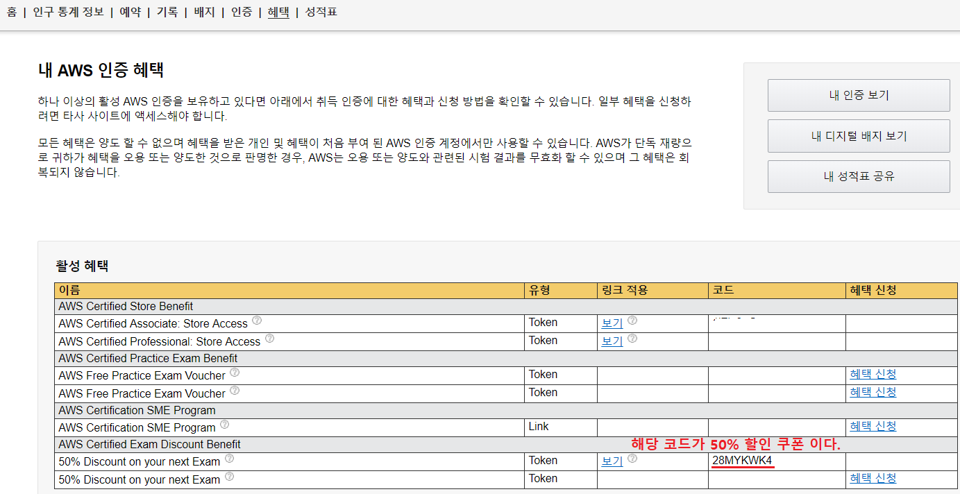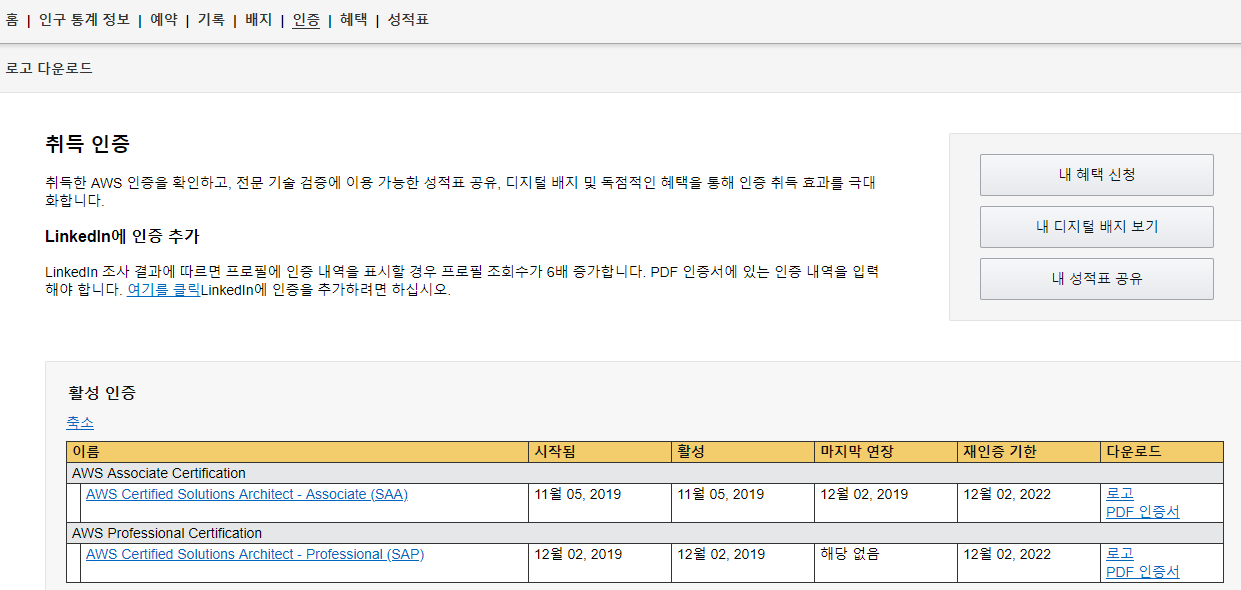 나의 경우는 AWS Solution Architect Associate와 Professional을 준비하고 취득 하였는데, 이와 관련된 내용은 별도의 포스팅을 진행 할 예정이고, 이번 포스팅에서는 신청 방법과 혜택에 대하여 적을 예정이다.