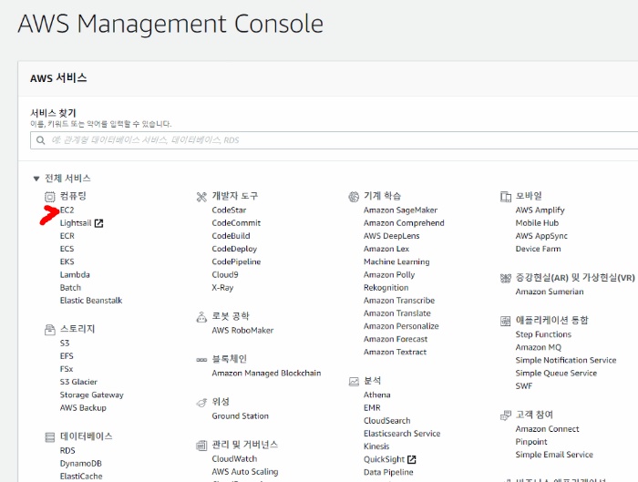- 선택후 보이는 서비스들이 해당 리전(서울)에서 서비스 가능한 리스트 이다.