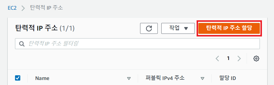 - 그럼 이제 우측 상단의 "탄력적 IP 주소 할당"을 클릭 하여 주자.