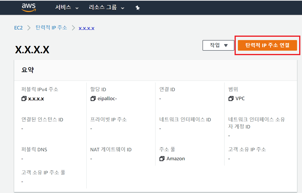 - 다만 연결된 인스턴스는 비어있기 때문에, 해당 고정IP와 본인의 인스턴스 연결 작업을 해야 한다.