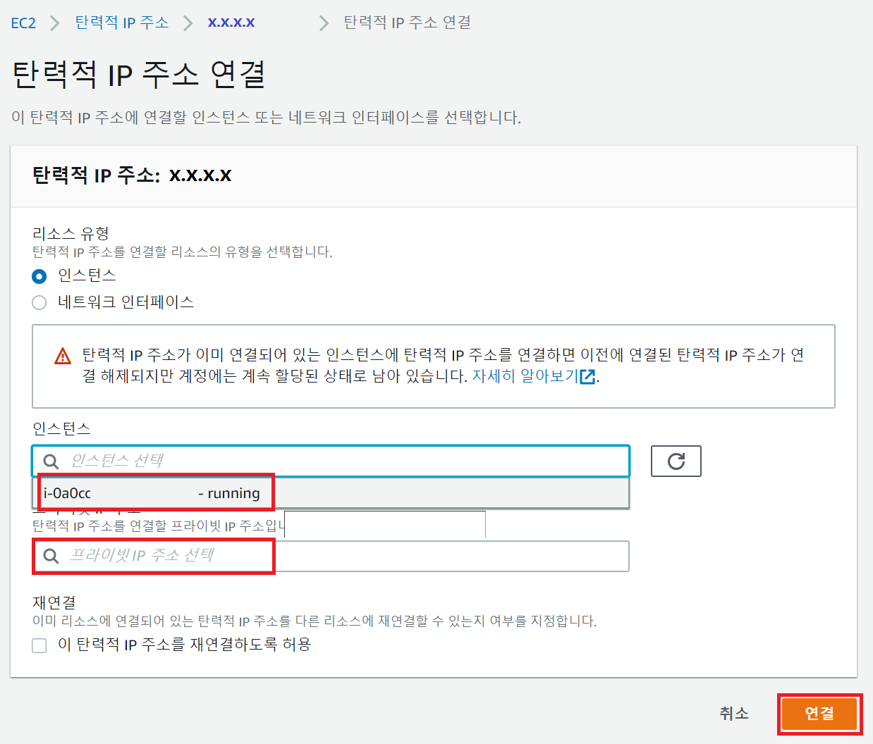 ▶ 6. 탄력적 IP 주소 연결 >> 본인이 연결하고자 하는 인스턴스(EC2 등) 연결 >> 프라이빗 IP 선택 후 연결 클릭.