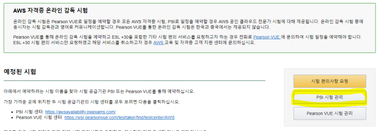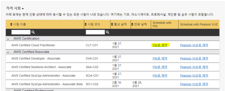 아래와 같이 AWS Certified Cloud Practitioner에서 PSI로 예약을 누르면 된다.