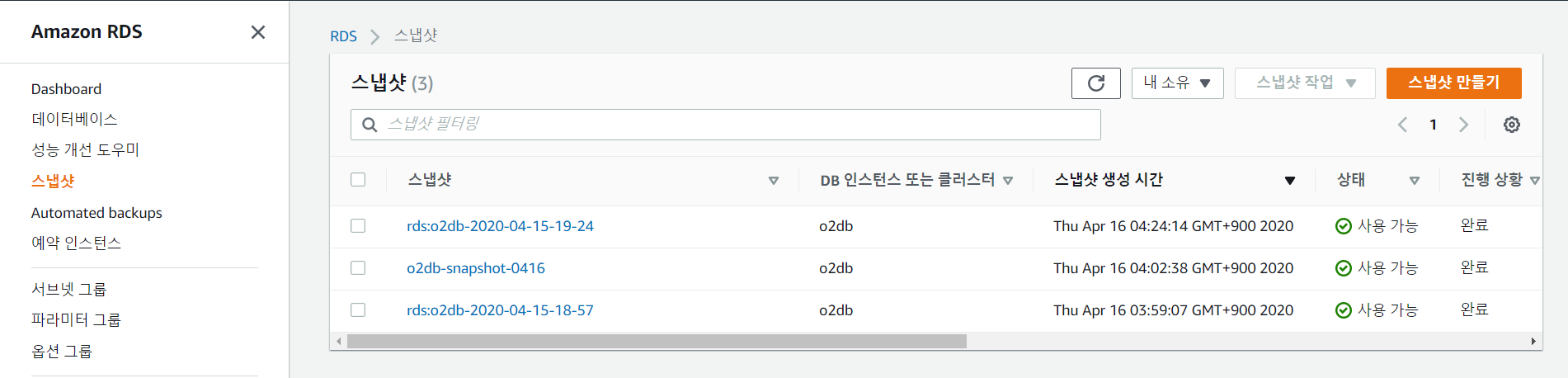 다른 방법으로는 특정 시간대에 RDS 스냅샷을 저장하여 이후 스냅샷을 이용하여 백업할 수 있다. 이는 사실 백업이라기 보다는 특정 시간대의 RDS의 정보를 저장해두고 이를 이용하여 새로 RDS 인스턴스를 초기화하는 것이다. 이는 백업과 똑같은 효과를 가져다 준다.