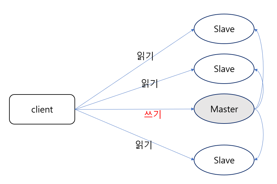 하나의 Master 인스턴스를 생성하고 나머지 Slave 인스턴스를 생성한다. 쓰기작업은 Master인스턴스에서 진행하고 정보를 Slave와 공유한다. 읽기작업은 Slave 인스턴스에서 진행한다. 위와 같이 작업을 단순화하여 Scale out 을 구현한다.