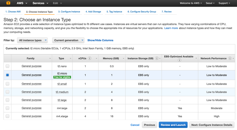 - 인스턴스 타입을 설정합니다. (EC2 생성시 설정하는 것과 같이 진행됩니다.)
