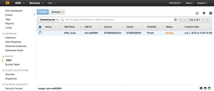 - 좌측에 IMAGES > AMIs 에 들어가보면, 이미지가 생성되고 있는것을 확인할 수 있습니다. (Status가 pending > available로 변경되면 완료된 것입니다.)