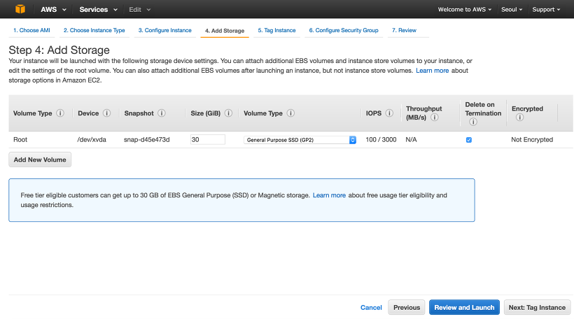 - Storage를 설정합니다. 필요하다면 저장공간을 더 확장할 수 있습니다.