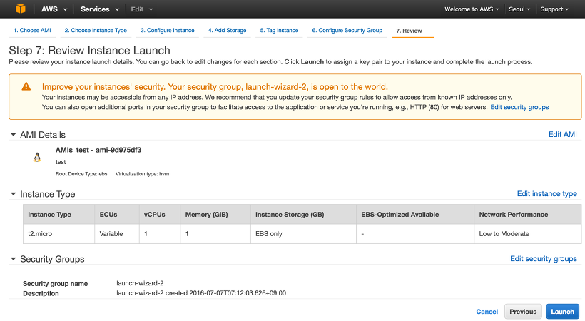 - 지금까지 설정했던 정보들을 확인하고, 정상적이라면 Launch를 눌러 인스턴스를 생성합니다.