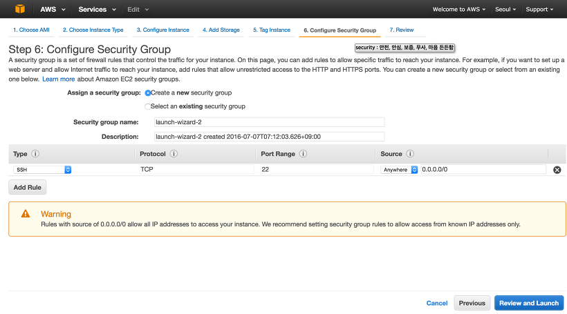 - Security Group을 설정합니다. 기존에 사용했던 보안 체계를 그대로 사용할 수 있고, 새롭게 설정할 수도 있습니다.