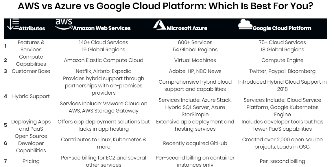 비즈니스 요구와 워크로드에 따라 클라우드 제공자를 선택해야 합니다. AWS, MS Azure, GCP 모두 동일한 기본 기능을 갖추었습니다. 모두 자가 관리, 즉각적인 프로비저닝, 자동 확장, 규정 준수, 보안, ID 관리 기능 등의 퍼블릭 클라우드 서비스를 제공하고 있죠.