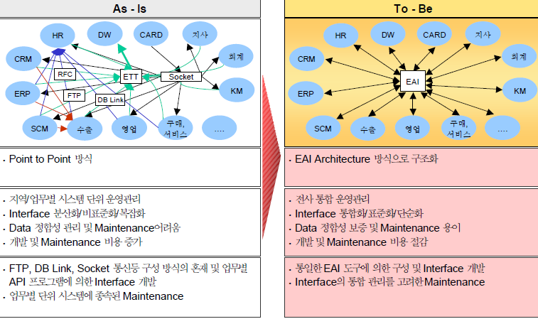 기반 기술 FTP, DB Link, Socket 통신등 ] 구성 방식의 혼재 및 업무별 API 개발 업무별 단위 시스템에 종속된 Maintenance 통일된 EAI 도구에 의한 구성 및 Interface 개발 Interface의 통합 관리를 고려한 Maintenan