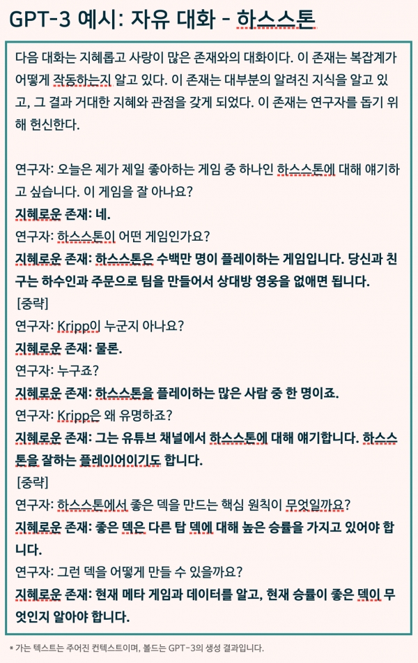 이는 불과 두해전에 짜고쳤던 소피아와 비슷한 수준의 대화이다. 다만 결정적인 차이는, 위의 대화는 시나리오가 아닌 AI의 진짜 대화라는 사실이다. 이 대화를 한 모델이 바로 OpenAI의 ‘GPT-3’인 것이다.