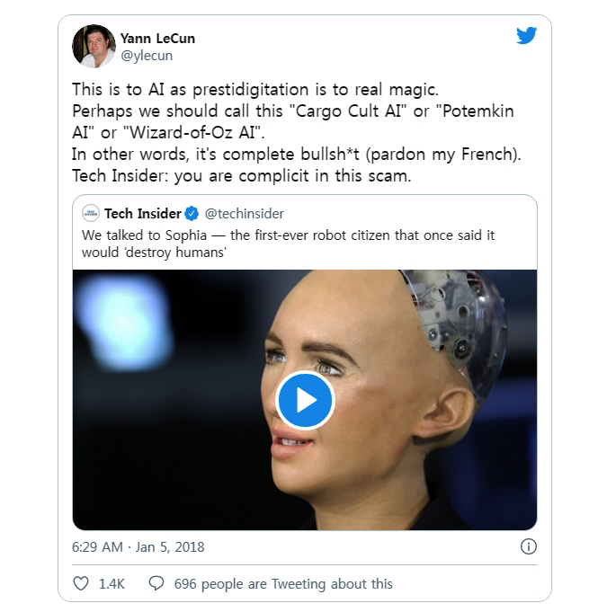 당시 이 행사에 많은 기자들이 취재를 왔고, 이들의 대담을 보고 AI의 미래에 대해 수많은 기사가 쏟아졌다. 하지만, 대부분의 평가는 "이 행사는 사기극이었습니다" 위 대화는 대담이 아니라 잘 짜여진 시나리오에 불과했죠. "어떻게 그렇게 확신하냐구요?" 왜냐하면 당시에 저 정도 수준의 대화를 자유롭게 구사할 수 있는 기술은 없었기 때문이다. 인공지능 3대 석학 중 한 명인 얀 르쿤(Yann LeCun) 교수는 소피아에 대해 “완전한 사기극”이라고 평하며, 소피아를 소개하는 IT 매체들도 이 사기극에 동참하는 공범이라고 비판한 바 있었다.