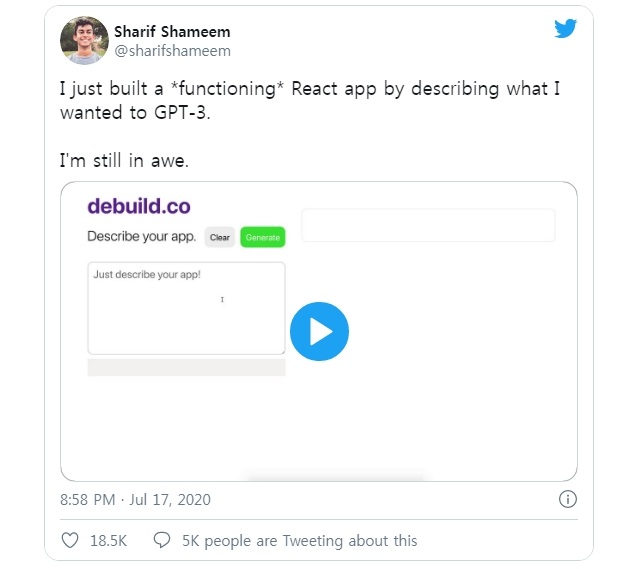 자연어로 홈페이지나 앱을 설명하면, 그에 대한 코드가 나오고, 이를 돌려볼 수 있다.(아래 동영상을 참고하면 된다.)