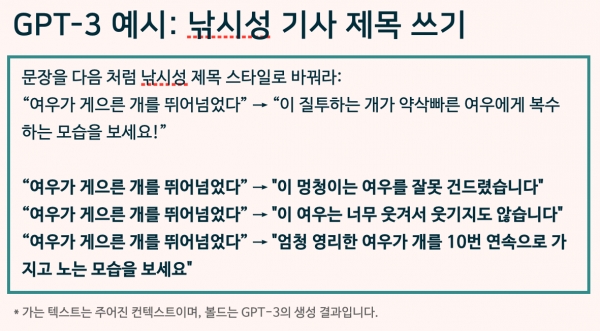 문장을 주고 이를 낚시성 기사 제목 스타일로 바꾸라고 하면 바꿔준다. GPT-3는 아래의 예시처럼 수행해야 할 일의 예시를 직접 보여주면 성능이 높아지는 경향을 보인다.