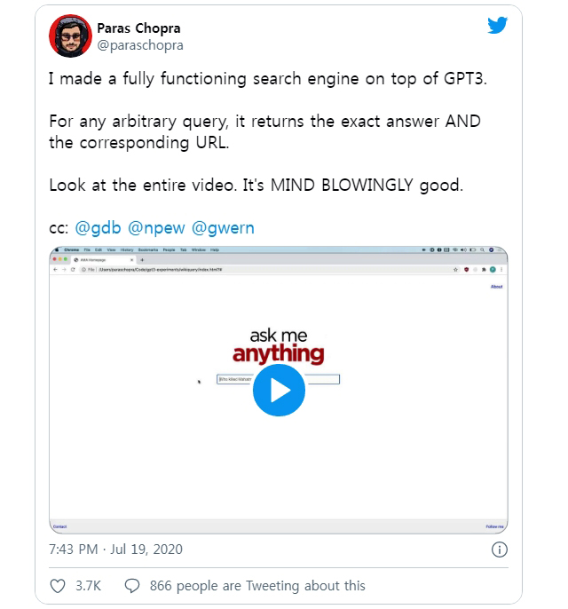 그렇기 때문에 이 특성을 활용해 무엇이든 답을 해주는 검색엔진도 만들어볼 수 있습니다. (동영상을 재생하면 어떻게 작동하는지 확인할 수 있다.)