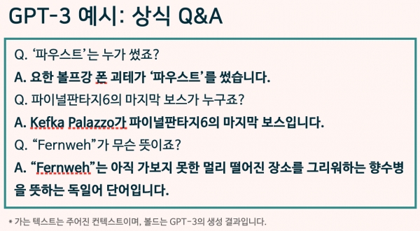이처럼 GPT-3에 컨텍스트를 어떻게 주는지에 따라 다양한 결과를 얻을 수 있다. GPT-3의 예시를 다시 한 번 살펴보면 모든 예시는 주어진 컨텍스트(가늘게 표시된 텍스트)에 대한 ‘자동완성’으로 생성된 결과(볼드로 표시된 텍스트)이다. 넓은 지식, 상식, 사고력을 갖지 않으면 할 수 없는 자동완성을 GPT-3가 해내고 있는 것이다. 이제 더이상 사람들이 GPT-3에서 인간 수준의 범용적인 인공지능(AGI) 느낌을 받는 것도 이상한 일이 아니다.
