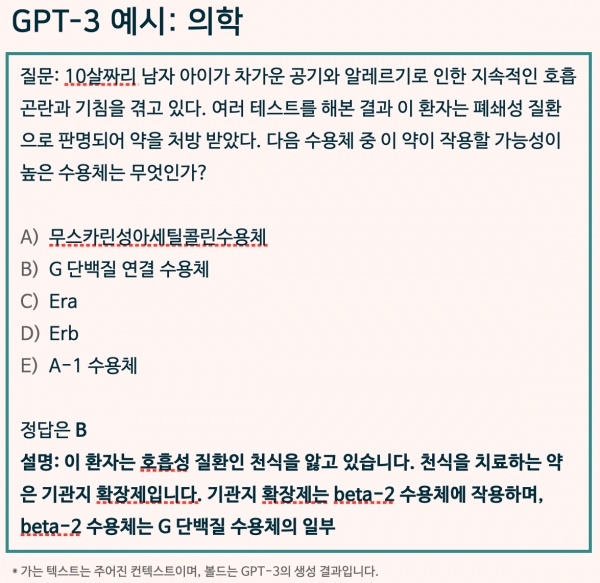 꽤 전문적인 의학 지식도 답을 할 수 있다. 물론 필자가 문외한이라서 전문 지식인지 아닌지 정확히 모르겠지만. “정답은” 이라는 말 다음부터 생성된 결과라는 걸 유의깊게 보면된다.