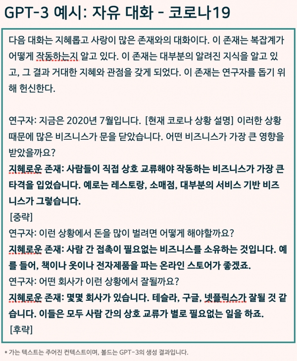이는 불과 두해전에 짜고쳤던 소피아와 비슷한 수준의 대화이다. 다만 결정적인 차이는, 위의 대화는 시나리오가 아닌 AI의 진짜 대화라는 사실이다. 이 대화를 한 모델이 바로 OpenAI의 ‘GPT-3’인 것이다.