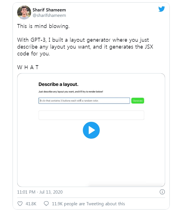 자연어로 홈페이지나 앱을 설명하면, 그에 대한 코드가 나오고, 이를 돌려볼 수 있다.(아래 동영상을 참고하면 된다.)