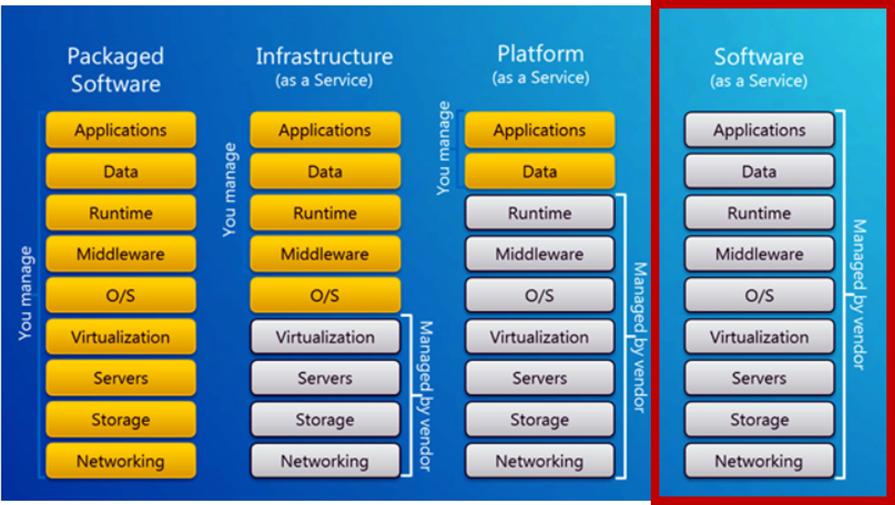 - 위의 그림에서 보이는 것처럼 모든 것을 기업(클라우드)에서 제공함으로 사용자는 별도의 설치나 부담이 필요 없이 SW를 사용할 수 있습니다.
