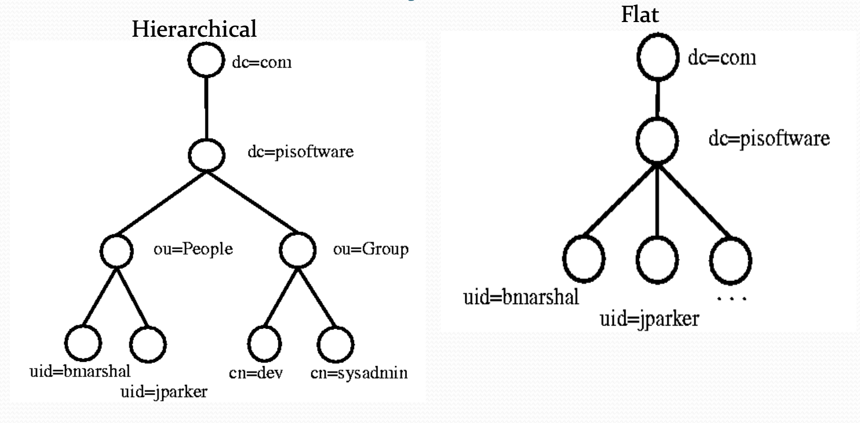 LDAP 서버에는 여러 디렉토리 정보(entry)가 계층적 트리 구조(hierarchical tree-like)로 구성되어 있다.