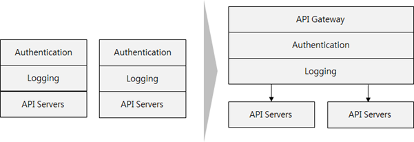아래 그림은 각 API 서버에서 인증과, 로깅에 관련된 로직을 API 게이트웨이로 이전한 구조이다.