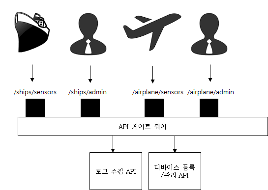 그리고, 이 서비스에서는 센서로 부터 데이타를 수집하는 시나리오와, 관리자가 웹을 통해서 시스템을 관리하기 위한 API가 있다고 가정하면, 앞의 API는 다음과 같이 클라이언트의 종류에 따라서 분리 될 수 있다.