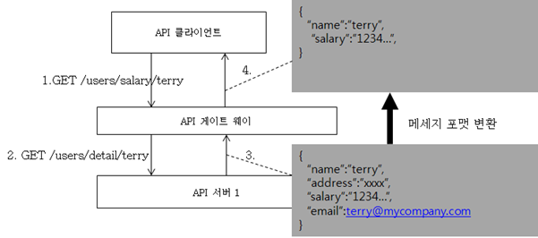 메세지 포맷을 변환하는 기능이란, JSON으로 된 요청(Request) 메세지가 들어왔을때, 이를 API 서버로 보낼때 변환 해서 보내거나, 또는 API 서버에서 생성된 응답을 클라이언트에 리턴할때 변경해서 보내는 기능을 의미한다.