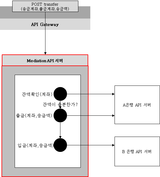 하는 3개의 API 호출을 하나의 API 인 POST transfer(인출계좌,입급계좌,금액)으로 구현한다고 하자.이를 API 게이트웨이에서 구현 하면 다음과 같은 형태로 구현할 수 있다.