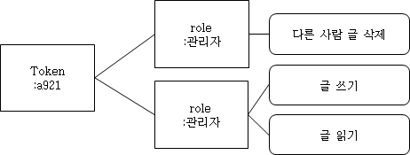 이렇게 권한을 제어하는 방식은 여러가지가 있는데, 각 개별 권한을 토큰에 부여 하는 방식과 역할(ROLE) 기반으로 권한을 부여하는 방식이 대표적이다.