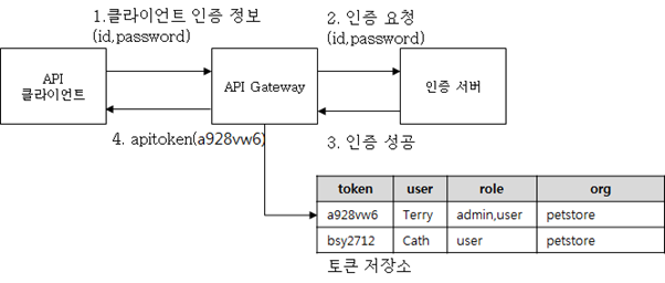 클라이언트를 인증하는 방법은 가장 간단하게 사용자의 id와 password를 넣는 방법에서 부터, 공인 인증서를 이용하는 방법, 지문이나 OTP (One time password) 등을 이용하는 방법등 다양한 방법이 있다. 각 보안 요건에 요구 되는 다양한 방식에 따라서 클라이언트를 인증한 후에, apitoken을 발급하게 된다.