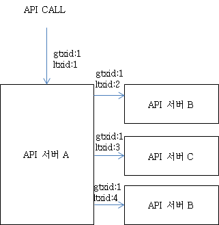2번에서, API 서버 A가 호출을 받으면, 서버 A는 헤더를 체크하여 ltxid를 체크하고, ltxid를 하나 더 더해서, 로그 출력에 사용한다. 같은 gtxid를 이용해서 같은 API호출임을 알 수 있고, ltxid가 다르기 때문에 해당 API서버로는 다른 호출임을 구별할 수 있다.