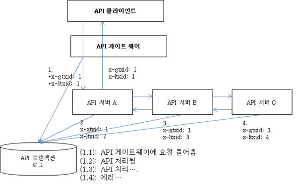 <그림, gtxid,ltxid를 이용한 API 트렌젝션 추적 아키텍쳐>