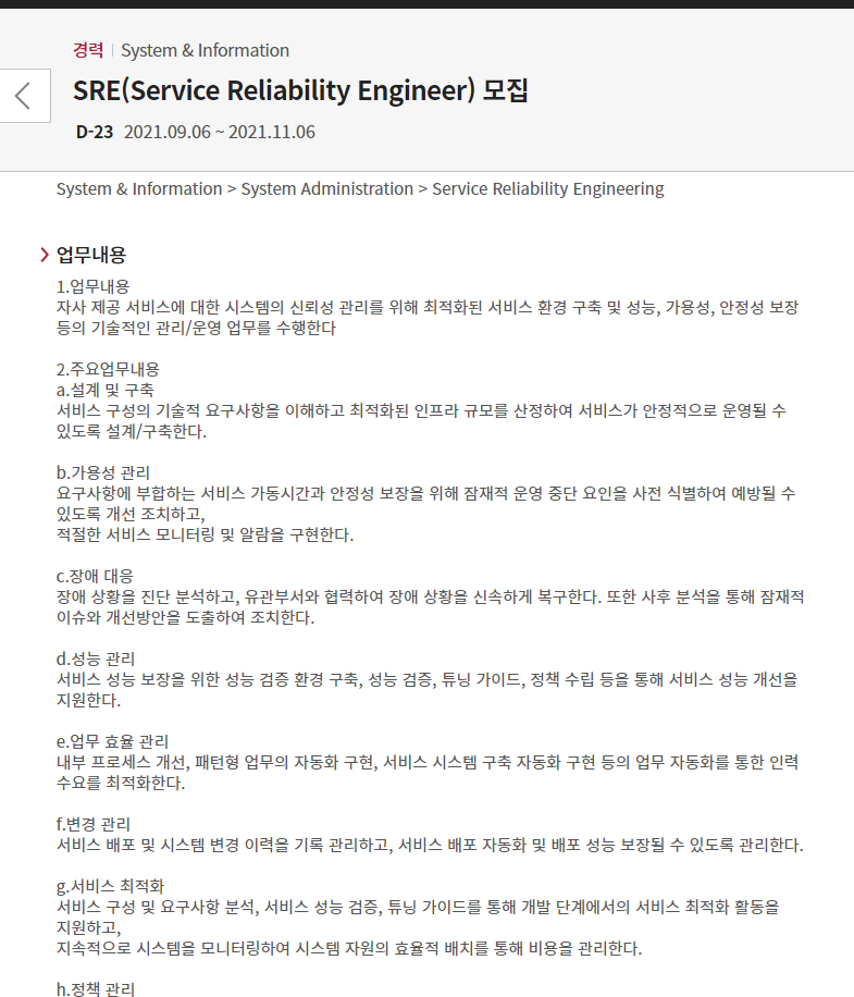 자사 제공 서비스에 대한 시스템의 신뢰성 관리를 위해 최적화된 서비스 환경 구축 및 성능, 가용성, 안정성 보장 등의 기술적인 관리/운영 업무를 수행한다