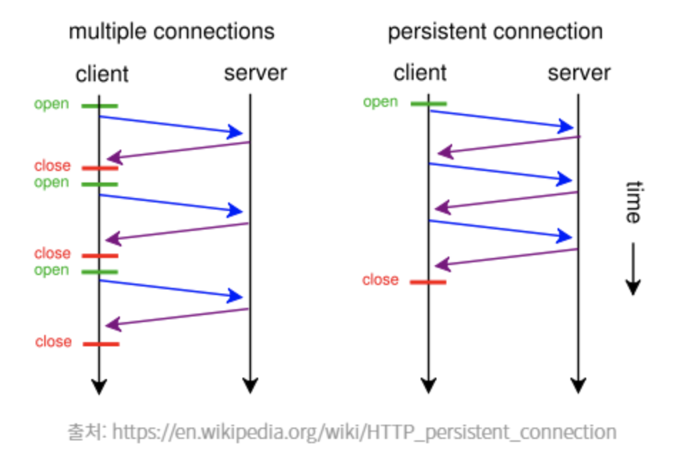- Psersistent Connection(Keep-alive)는 연결을 지속하며 클라이언트와 서버 통신이 이루어진다.