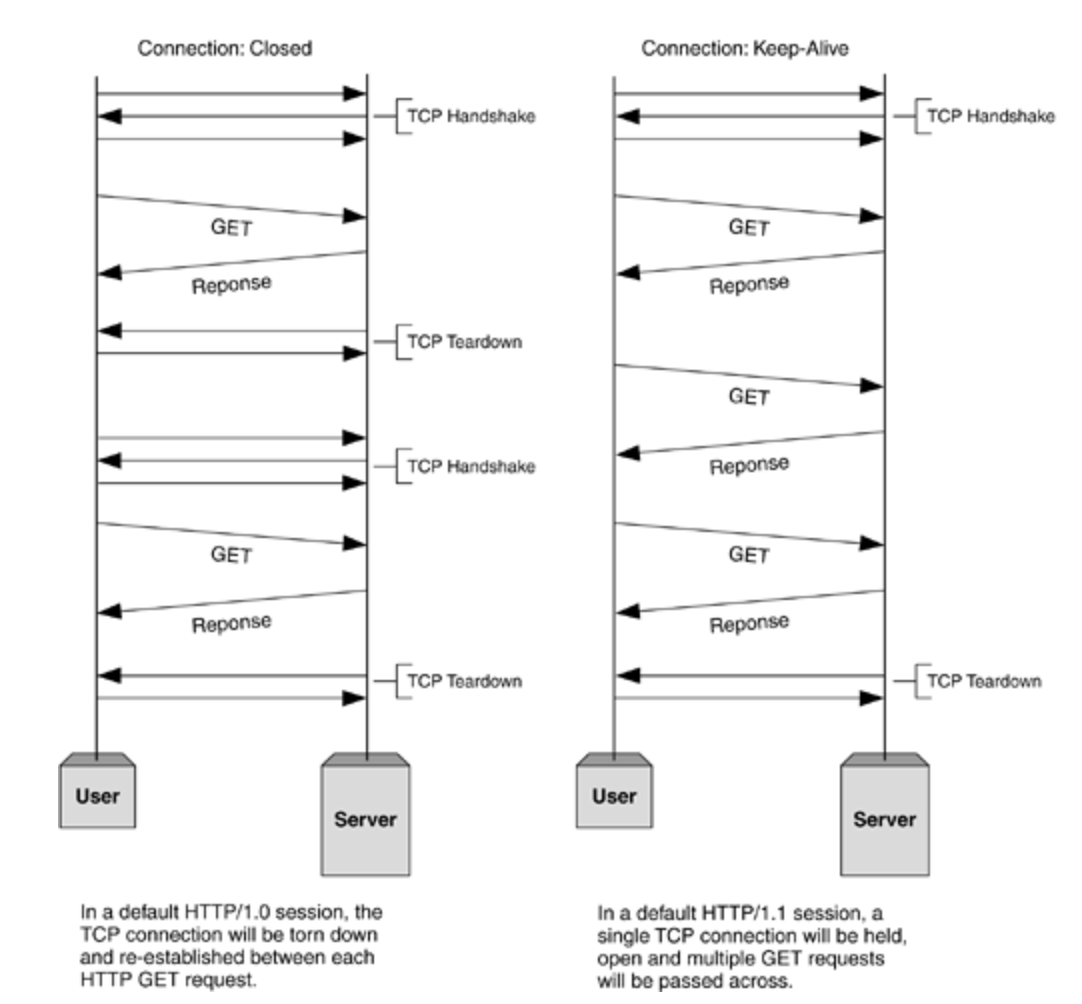 - 초반에는 해당 방법이 그리 큰 문제가 되지 않았지만, 웹 사이트의 콘텐츠가 늘어나면서(이미지와 같은) TCP 연결의 재사용이 필요하게 되었다. 이 때 나온 기술이 Psersistent Connection(Keep-alive)이다