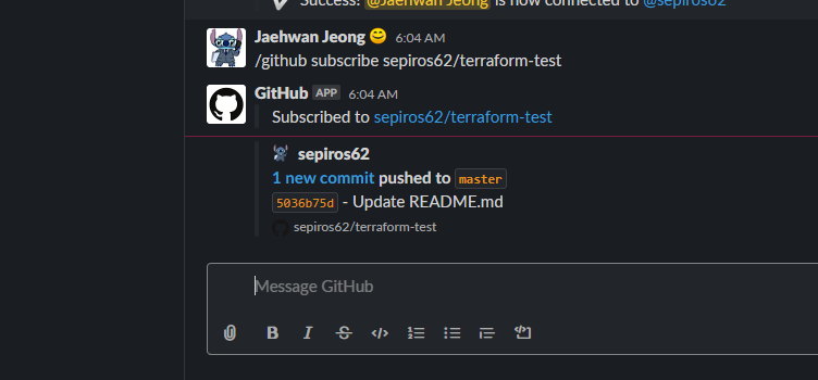 8. Slack 창에서 GitHub의 sepiros62/terraform-test 리포지토리를 구독한다는 메시지 출력